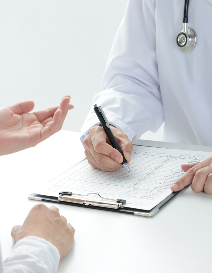 Ausführliche Anamnese, großes Labor/Blutabnahme, Schilddrüsen-Sonografie bei Bedarf medizinisch fundierte